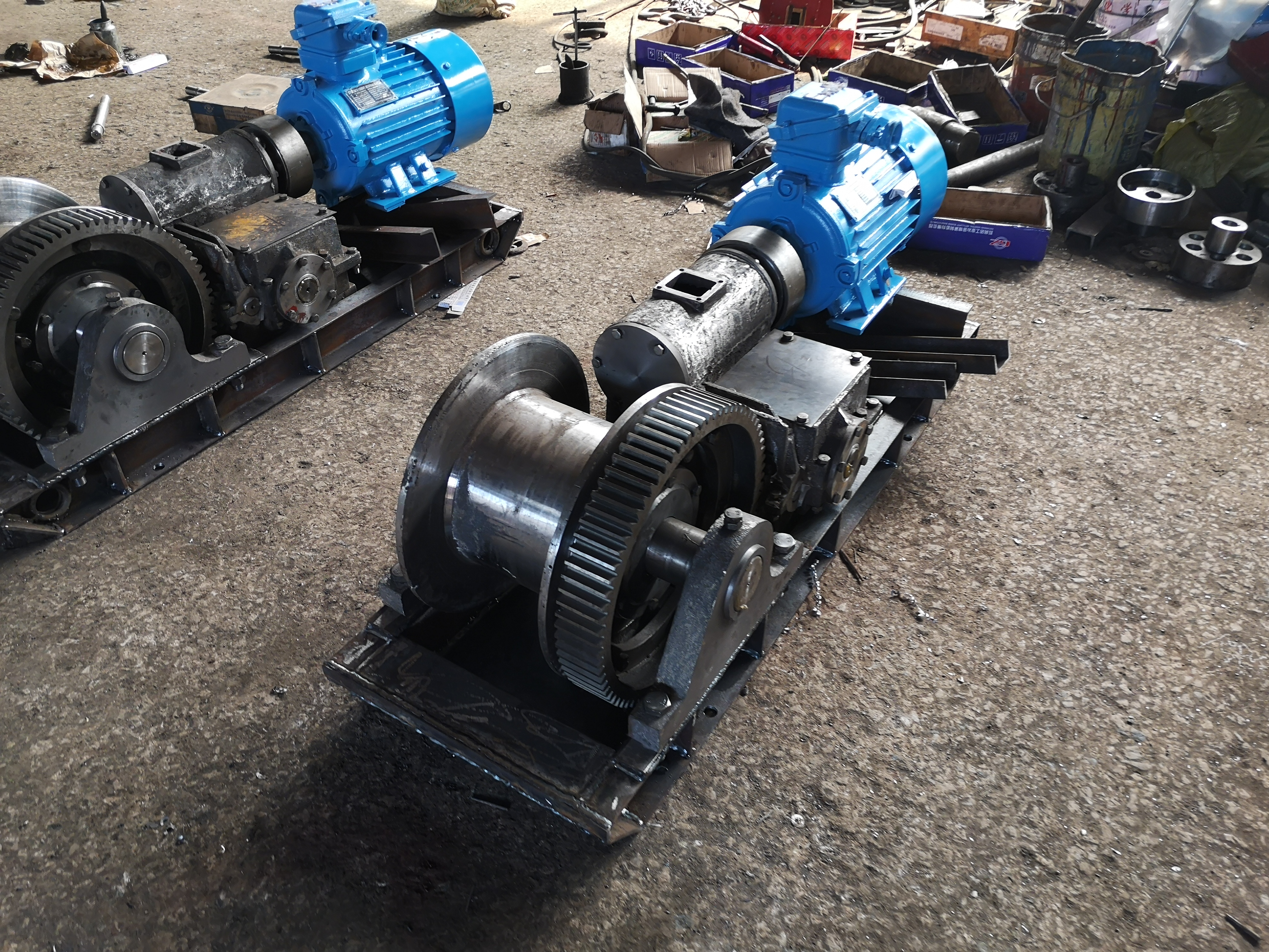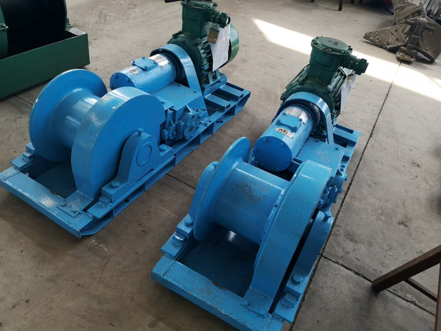 絞車主要由防爆電動(dòng)機(jī)、一組斜齒輪、蝸輪減速器、過橋齒輪、傳動(dòng)齒輪,卷筒及底座等主要部分組成